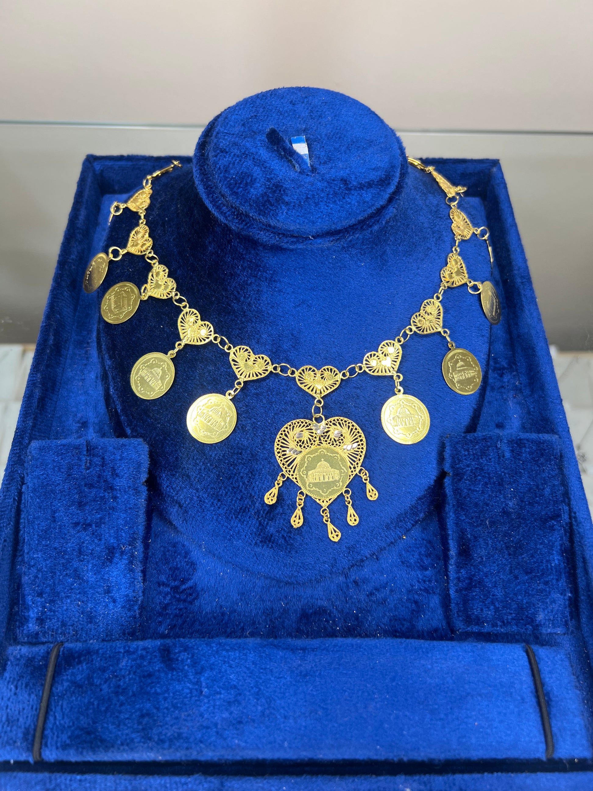 تألقي بقطعة فاخرة تجمع بين الفضة اللامعة والذهب الفخم مع هذا العقد الاستثنائي. مستوحى من مدينة القدس العريقة، مثالي لإضافة لمسة من الأناقة والتميز لإطلالتك اليومية أو للمناسبات الخاصة
