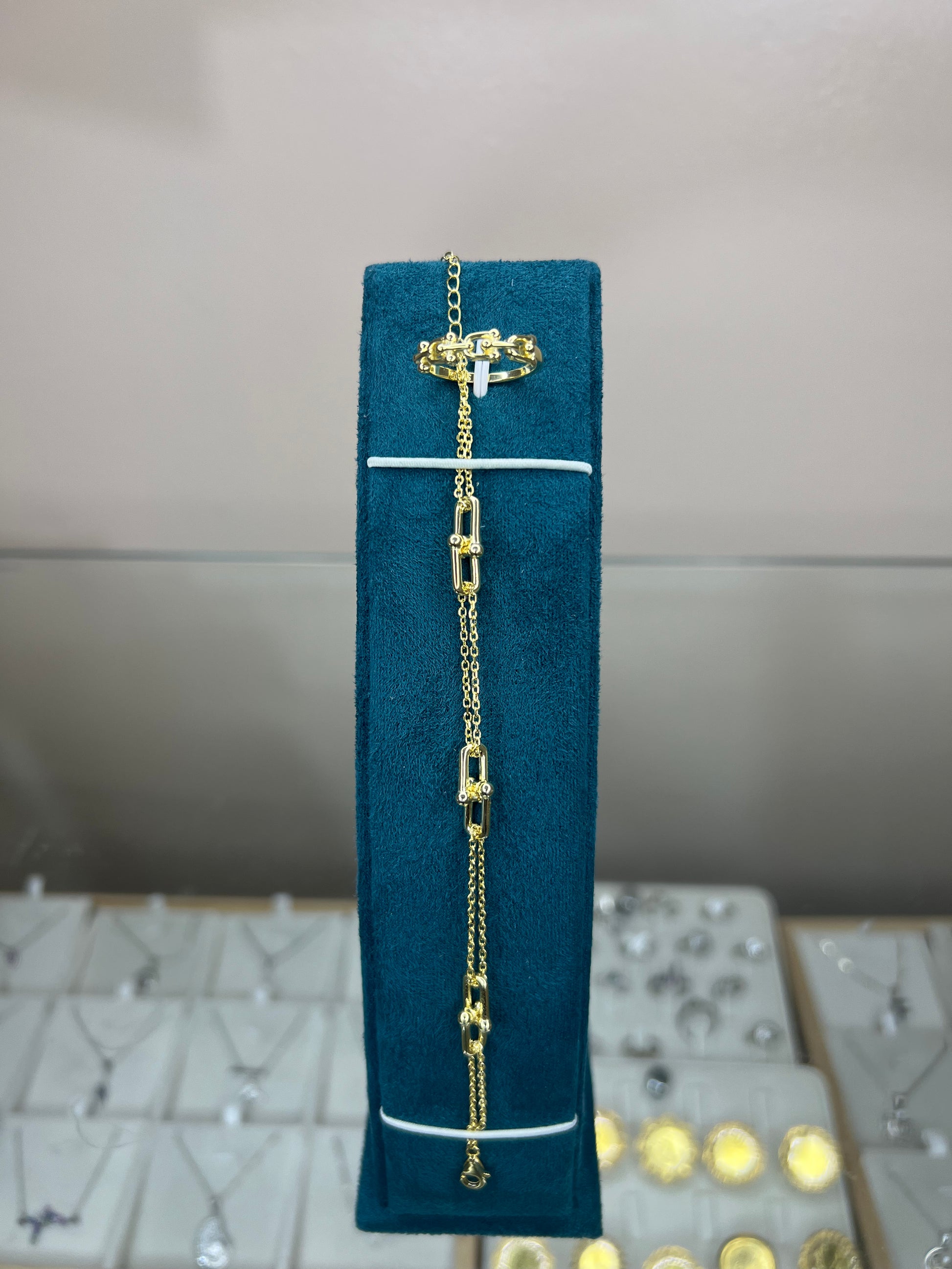 طقم راقٍ يتكوّن من سوار وخاتم بتصميم تيفاني عصري، مصنوع من فضة خالصة عيار 925 ومطلي بطبقة ذهبية فاخرة تمنحه لمعانًا يدوم. يتميّز بخطوطه الناعمة ولمسته الراقية، مناسب للاستخدام اليومي والمناسبات، ويضفي أناقة بسيطة وعصرية على إطلالتك